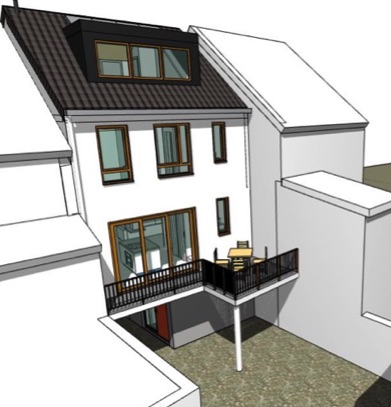 The entrance of the house is in the passageway. An open plan first floor with adjacent terrace caters for the living spaces, while on the second and third floor bedrooms and the bathroom are to be found.